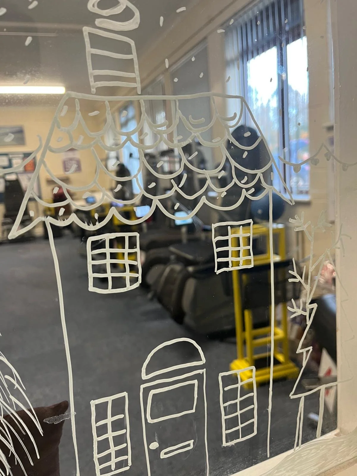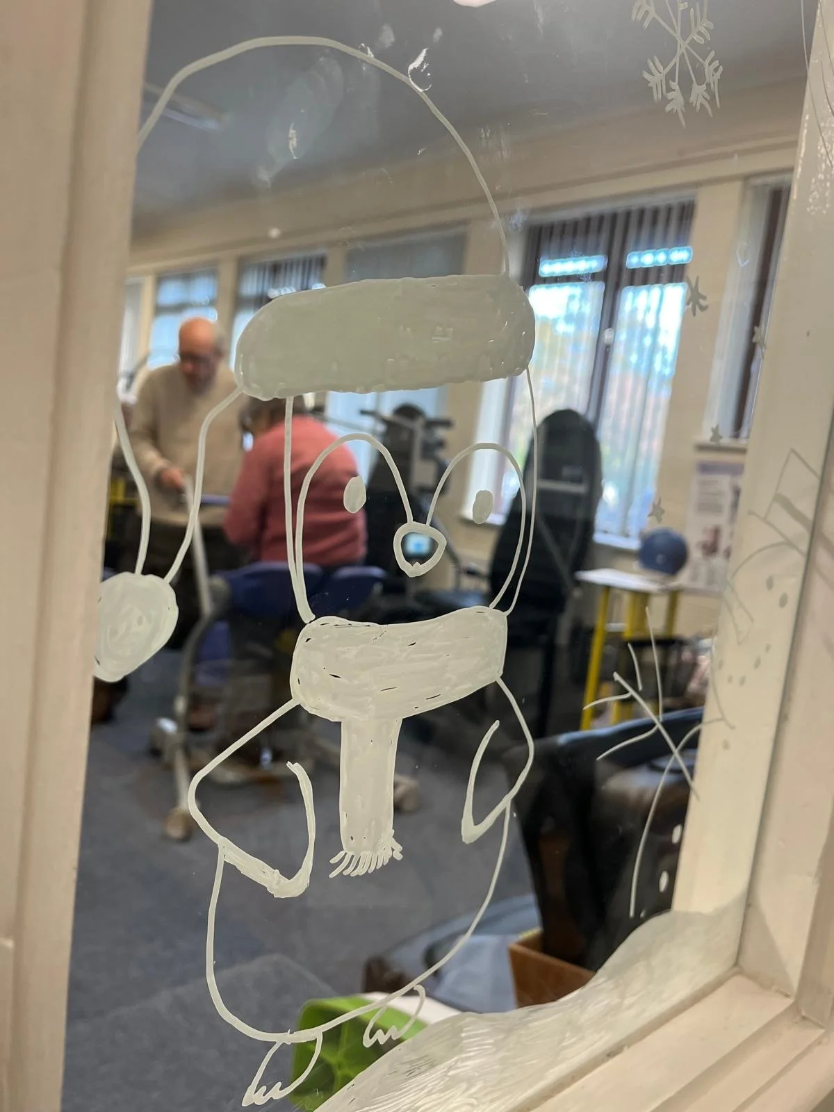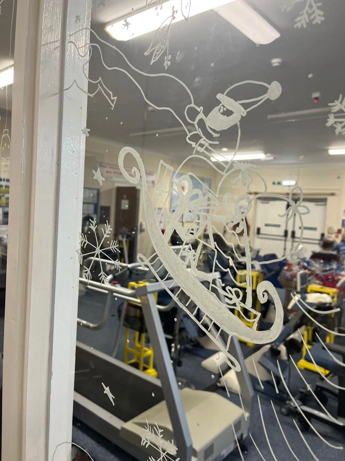 Our ‘Evening of Festive Fun’ fundraising event will be taking place in just over a week’s time on 6th December and in the meantime our amazing staff member Julie has been busy decorating the windows with her incredible artwork alongside helping our clients.